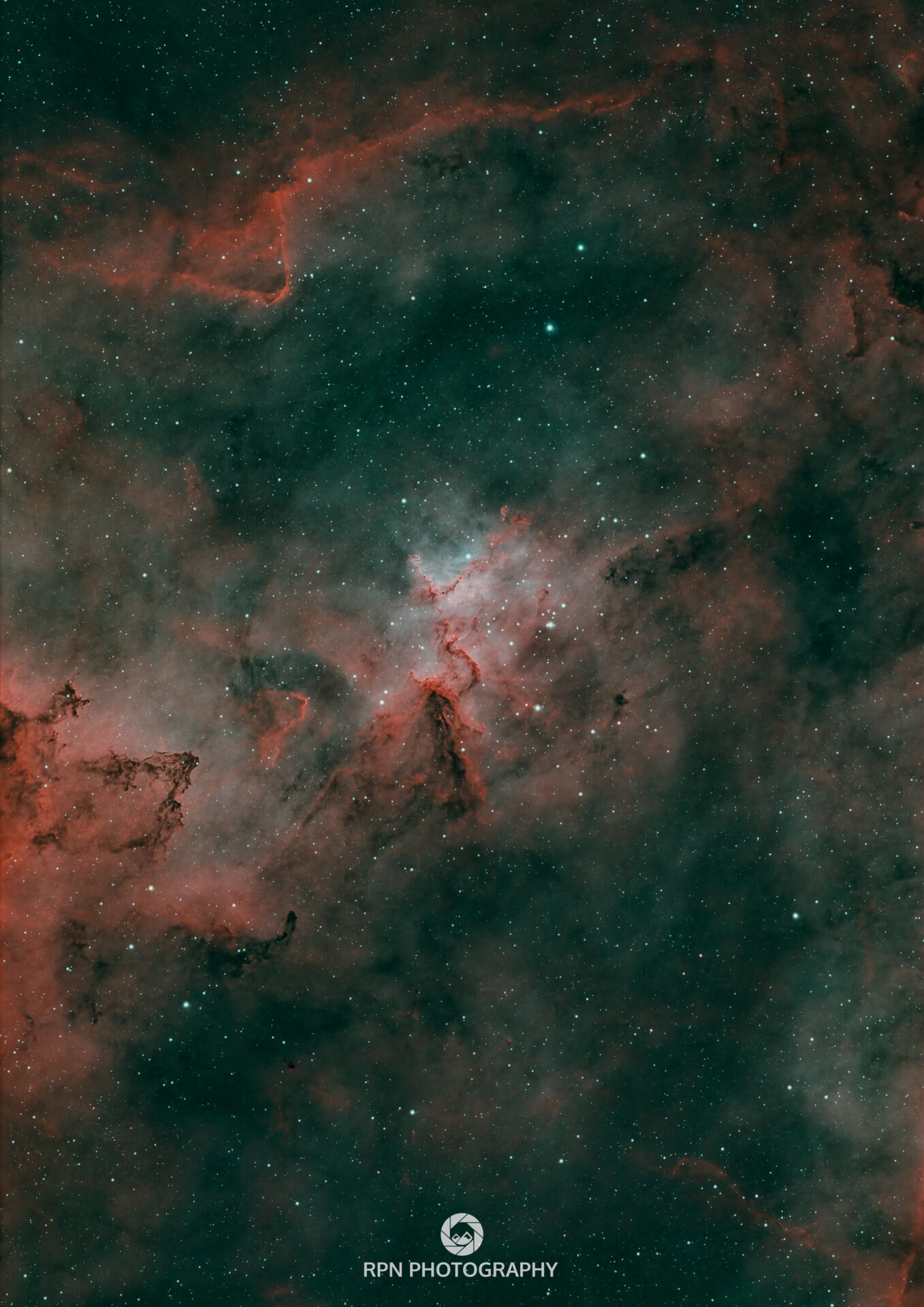 This is where we use the oxygen channel twice during the processing to make the image, alongside the hydrogen data, and discard the sulphur channel narrowband data. This is what gives the image its rather menacing red and subtle green tones, compared with some of my other image finishes.