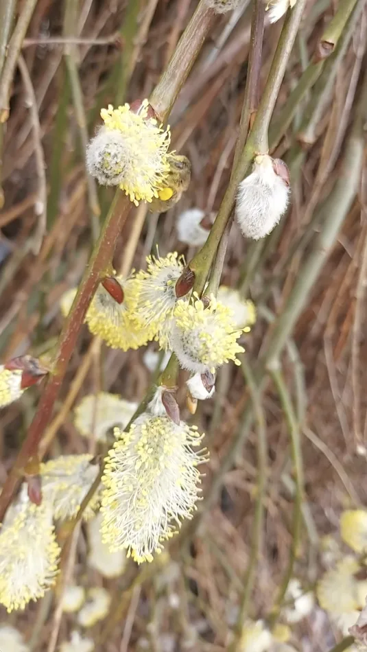 Goat willow is dioecious, meaning male and female catkins appear on separate trees. By mid-to-late February, male catkins are at their fluffiest, weighed down with pollen and nectar. Female catkins are less kitten-like, but still offer essential nectar. Unlike the dangly yellow hazel catkins, which rely on the wind for pollination, goat willow depends on insects, especially bees. On a sunny, calm day, a flowering willow will literally hum with bumblebees, solitary bees, honeybees and hoverflies. Later, when its rounded, curly-tipped leaves appear, they are food for many moth and butterfly caterpillars, with the purple emperor perhaps its most regal and rare diner.