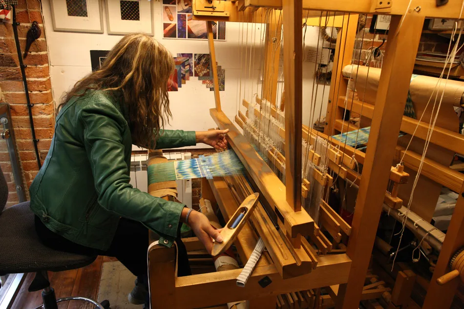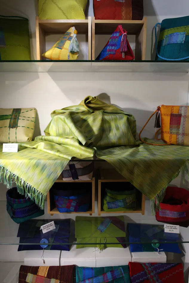 Debby Kirby’s loom has sung through Walford Mill for 40 years as she weaves her hand-dyed silk into luminous accessories and wall art