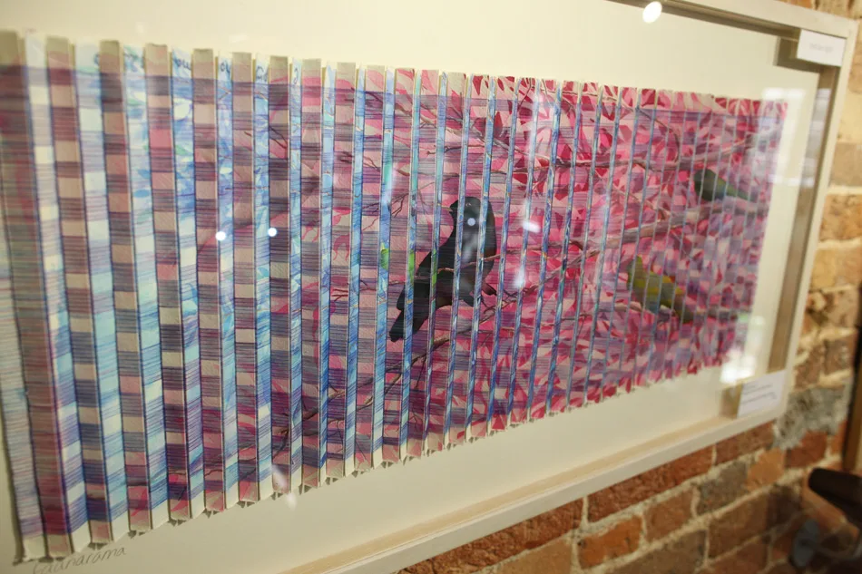 One of her most distinctive projects emerged this way: weaving silk with paper. Developed over more than twenty years with a calligrapher friend, this unique technique has evolved into three-dimensional hanging works and collaborations with painters and photographers, with pieces displayed in hotels, surgeries and private homes.