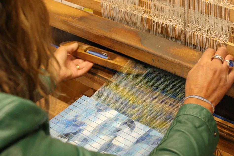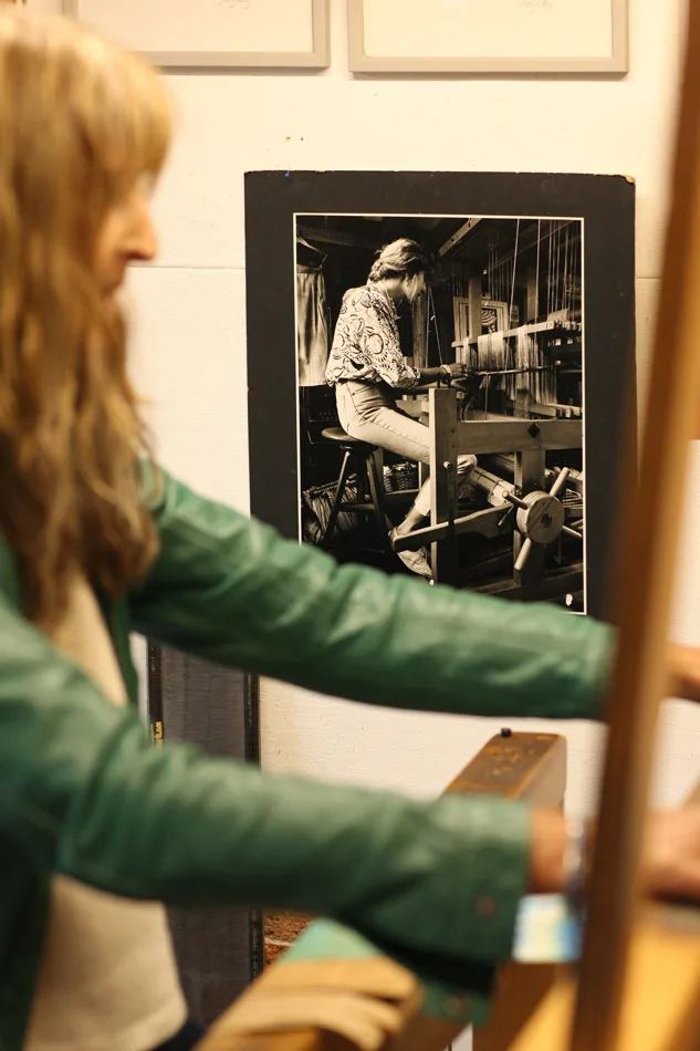 Nestled on the mezzanine, her loom sits in full view of the mill visitors, who often pause to watch silk transform, thread by thread, into something luminous, tactile and beautiful.