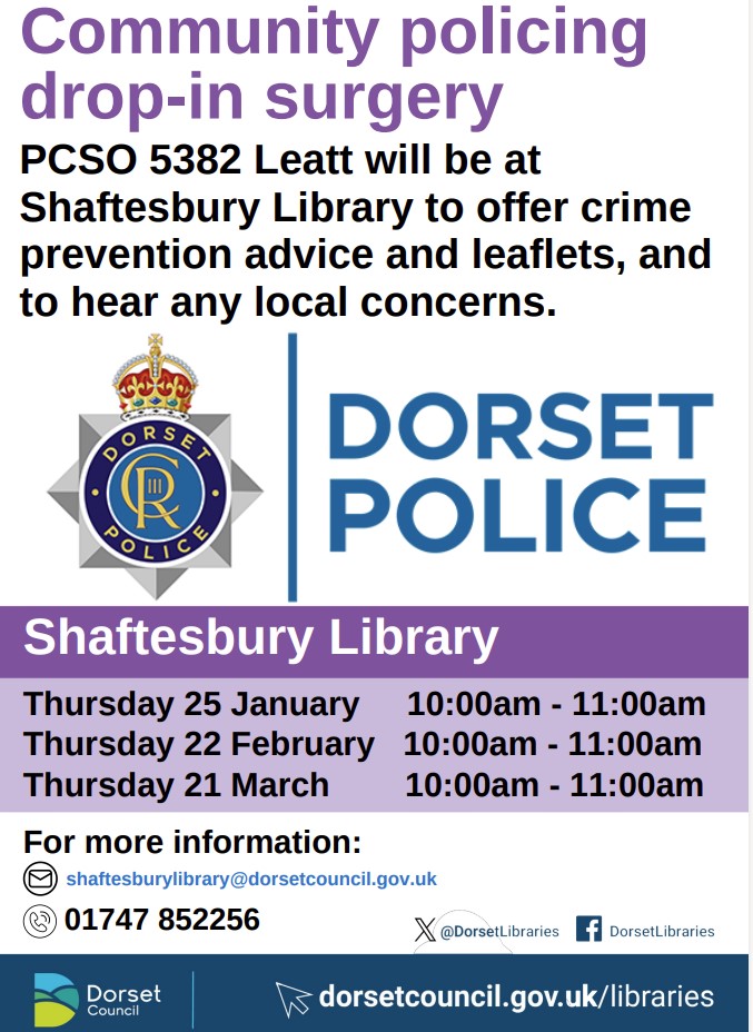 Community policing drop-in surgery PCSO 5382 Leatt will be at Shaftesbury Library to offer crime prevention advice and leaflets, and to hear any local concerns. Shaftesbury Library Thursday 21 March10:00am - 11:00am For more information: 01747 852256 [email protected]