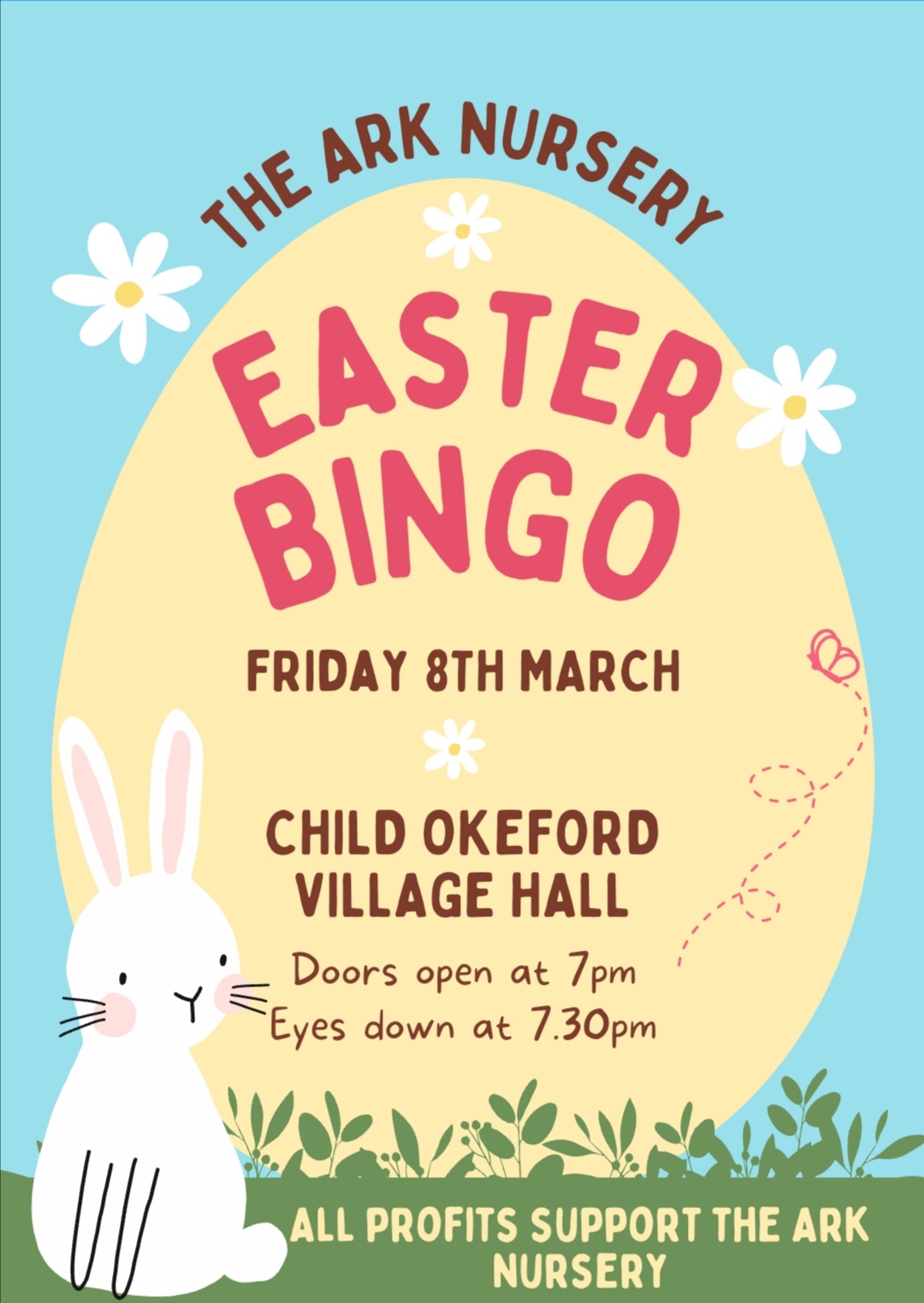 Easter Bingo Supporting the Ark Nursery Child Okeford Doors open 7pm Eyes Down 7:30pm