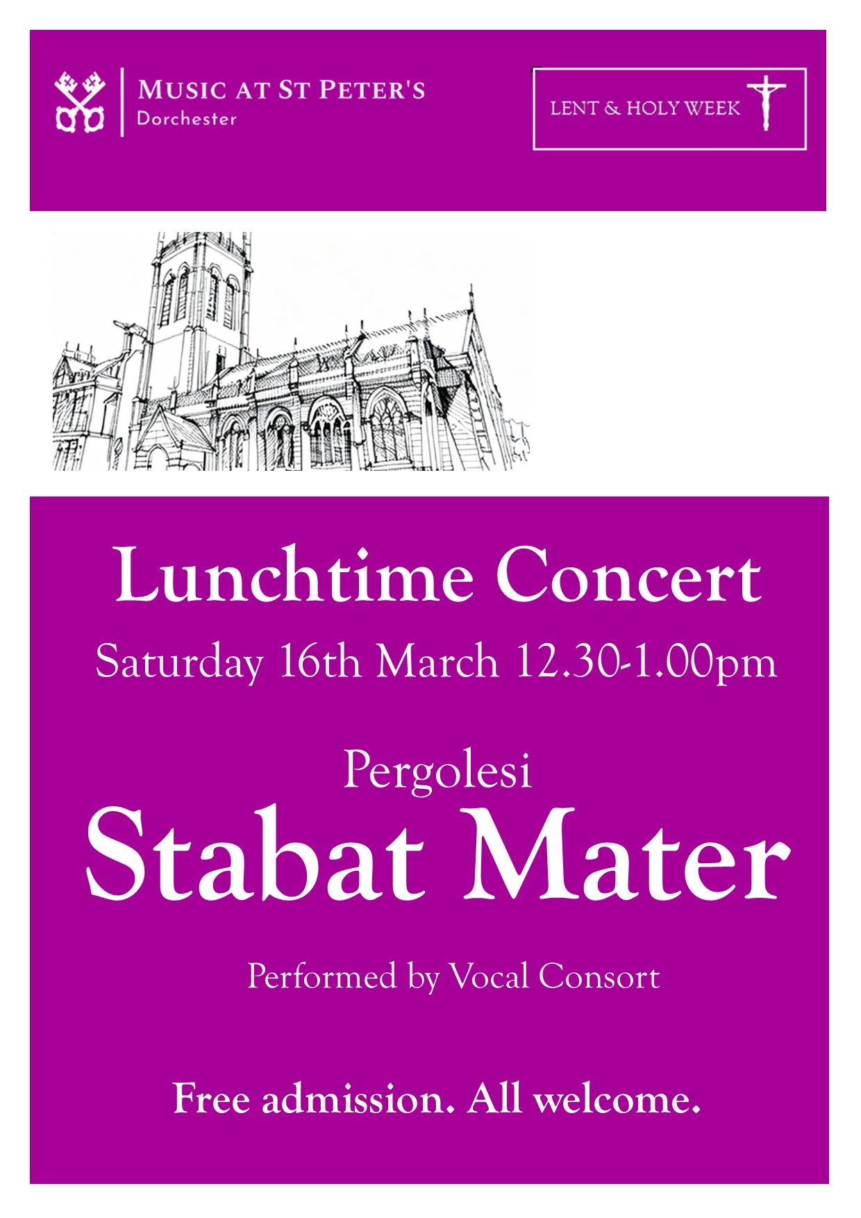 Join us at St Peter's Church, Dorchester on Saturday 16th March between 12.30 and 1pm for our lunchtime concert in Lent, when we offer a performance of Pergolesi’s ‘Stabat Mater’. This plaintive choral masterpiece will be sung by vocal consort. Spend a truly restful and reflective half an hour with us in the midst of […]