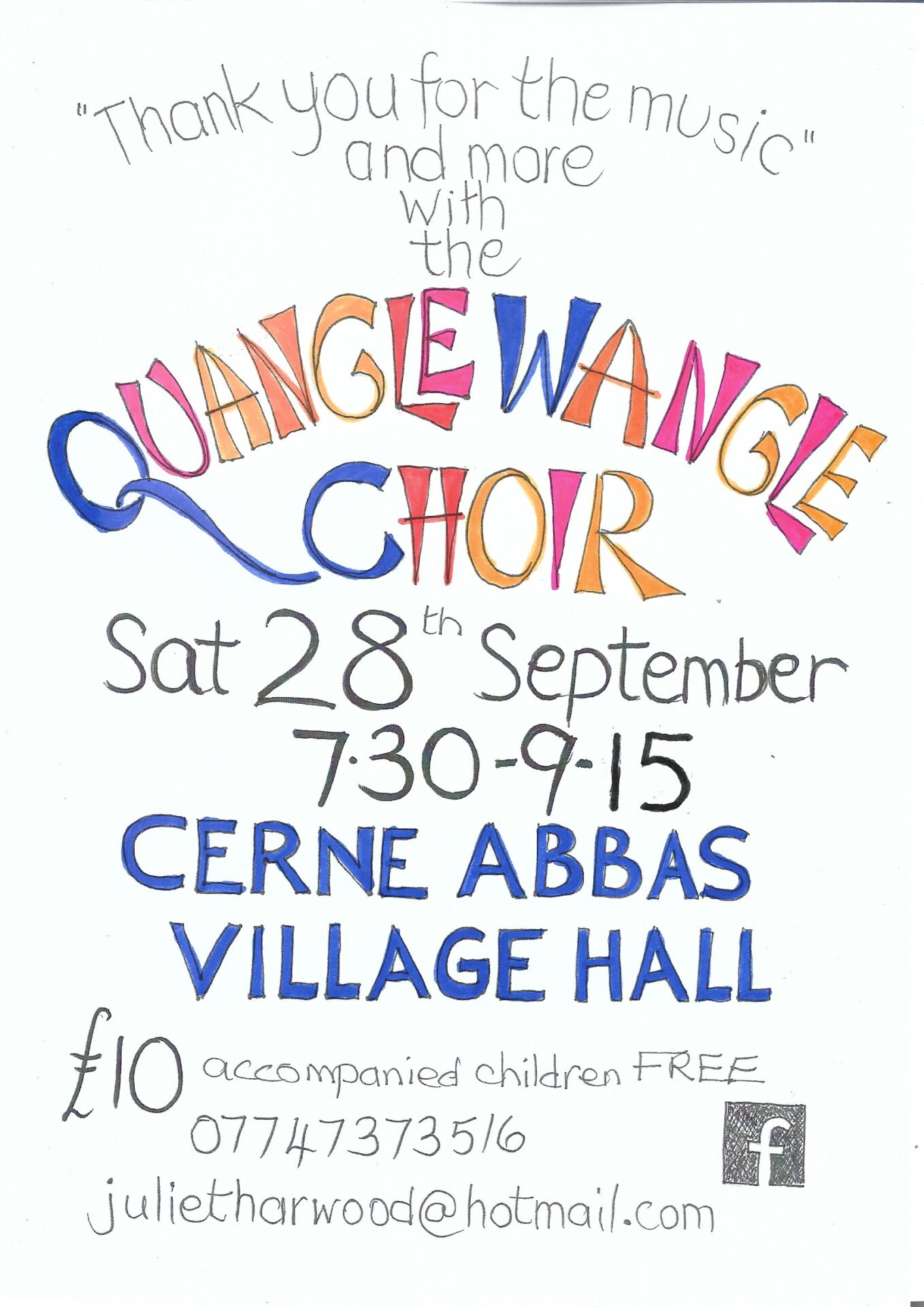 Cerne Abbas Village Hall Kettle Bridge Lane, Cerne AbbasThe Quangle Wangle Choir will entertain at Cerne Abbas Village Hall. Songs of the sea and the seasons, from pop to folk to more serious fare. A smorgasbord of musical and poetic delights! Tickets available through the website, at Cerne Abbas Village Stores or on the door. Accompanied children go free.
