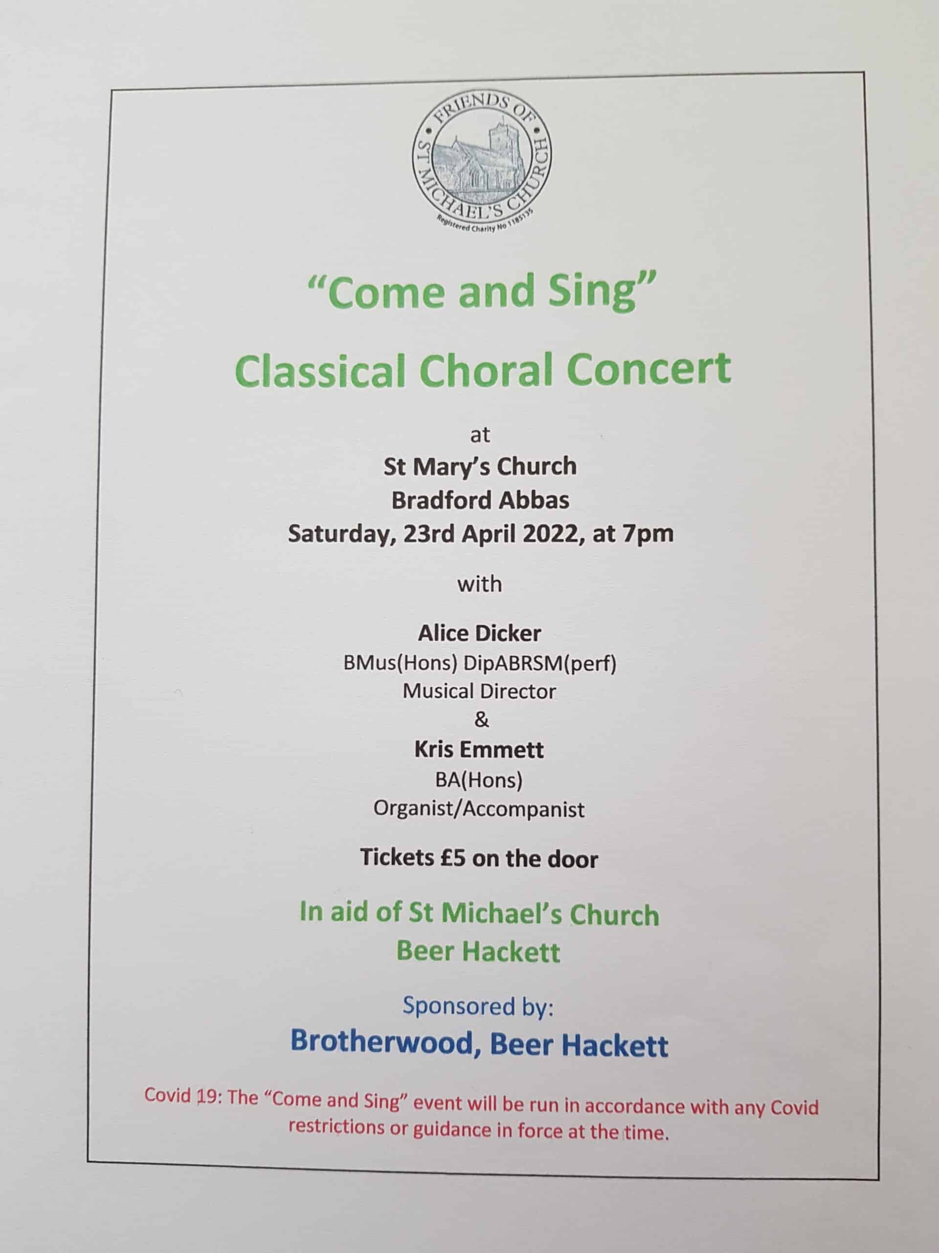An evening concert of classical choral pieces including Vivaldi’s “Gloria” and Handel’s “Messiah” under the expert musical direction of Alice Dicker BMus(Hons) DipABRSM(perf) and with accomplished organist Kris Emmett BA(Hons) taking place on Saturday, 23rd April 2022 at 7.00pm in St Mary’s Church, Bradford Abbas, performed by our "Come and Sing" choir following an intensive […]