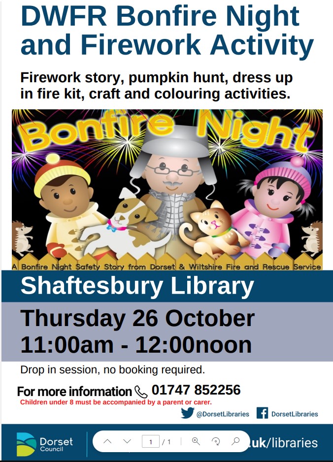 DWFR Bonfire Night and Firework Activity Shaftesbury Library Thursday 26 October 11:00am - 12:00noon Firework story, pumpkin hunt, dress up in fire kit, craft and colouring activities.