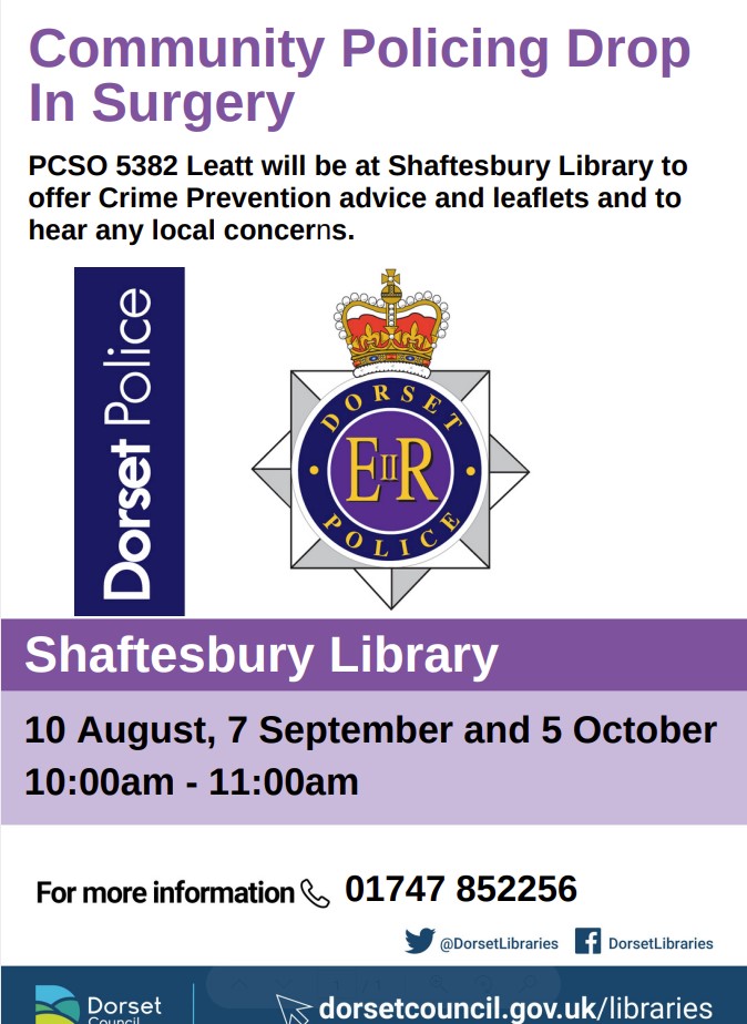 Community Policing Drop In Surgery. PCSO 5382 Leatt will be at Shaftesbury Library to offer Crime Prevention advice and leaflets and to hear any local concerns. Shaftesbury Library 5 October 10:00am - 11:00am. For further information please call Shaftesbury Library on 01747 852 256 or email [email protected].
