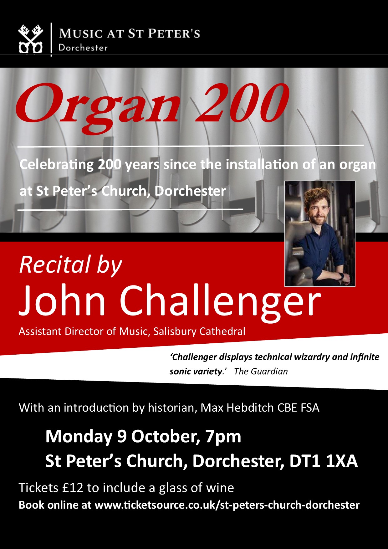 We are thrilled to announce that John Challenger (Assistant Director of Music at Salisbury Cathedral) will be giving a recital to celebrate 200 years of there being an organ at St Peter’s Church on Monday 9 October. John’s performance will be preceded by a brief introduction from the eminent historian Max Hebditch CBE FSA. The […]