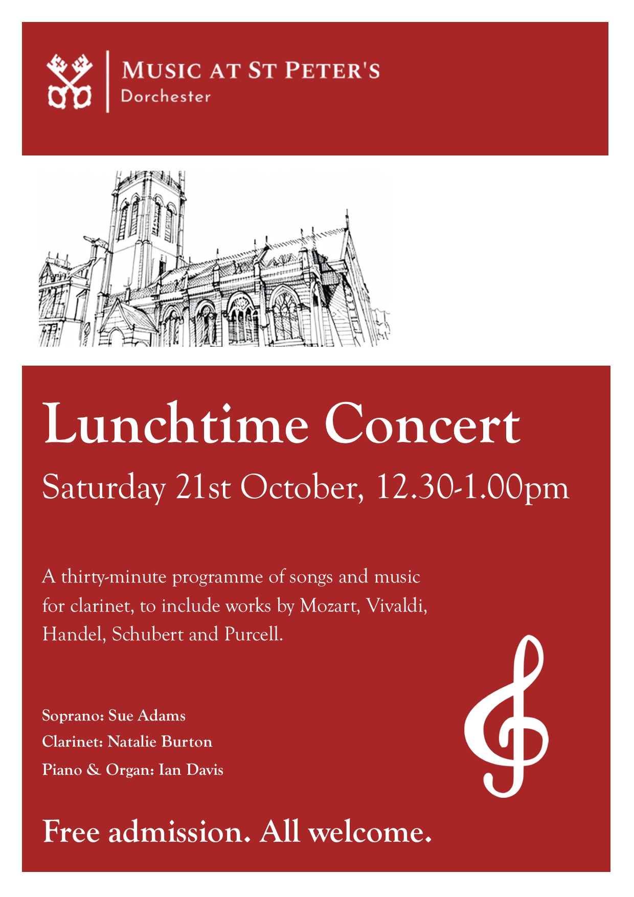 Join us at St Peter's Church, Dorchester on Saturday 21st October between 12.30 and 1pm for a lunchtime concert given by Sue Adams (soprano) and Natalie Burton (clarinet). The programme includes songs by Debussy, Mozart, Handel, Vivaldi and Schubert along with the adagio from Mozart's clarinet concerto. Admission is free and all welcome.