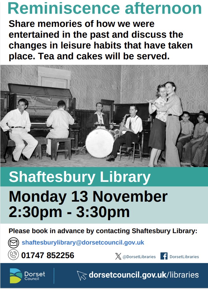 Reminiscence afternoon Share memories of how we were entertained in the past and discuss the changes in leisure habits that have taken place. Tea and cakes will be served. Shaftesbury Library Monday 13 November 2:30pm - 3:30pm 01747 852256 Please book in advance by contacting Shaftesbury Library: [email protected]