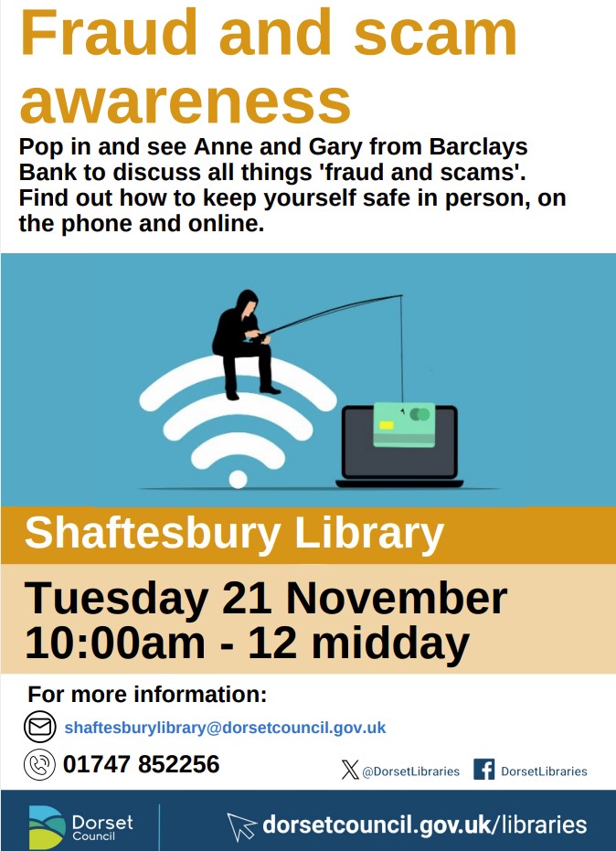 Fraud and scam awareness Pop in and see Anne and Gary from Barclays Bank to discuss all things 'fraud and scams'. Find out how to keep yourself safe in person, on the phone and online. Shaftesbury Library Tuesday 21 November 10:00am - 12 midday For more information email: [email protected] or call 01747 852 256