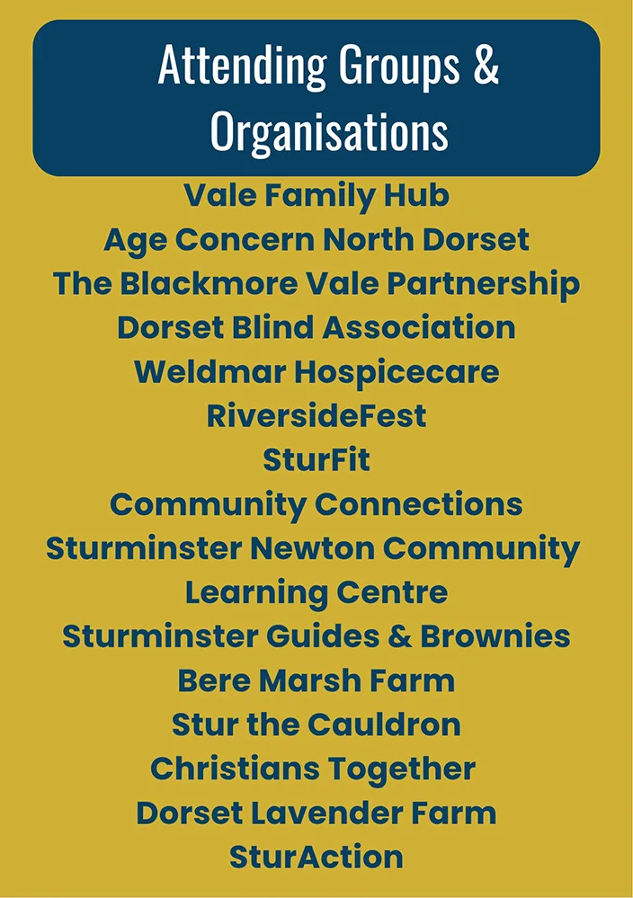 A wide variety of organisations will be attending, including Vale Family Hub, Age Concern North Dorset, The Blackmore Vale Partnership, Dorset Blind Association, Weldmar Hospicecare, RiversideFest, SturFit, Community Connections, Sturminster Newton Community Learning Centre, Sturminster Guides & Brownies, Bere Marsh Farm, Stur the Cauldron, Christians Together, SturAction, and Dorset Lavender Farm.
