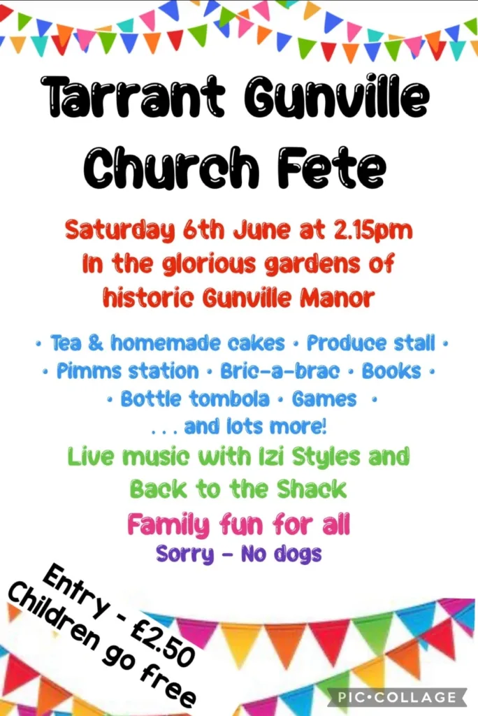 This year’s Tarrant Gunville Fete will take place on Saturday 6th June at 2.15pm in the glorious gardens of historic Gunville Manor. There will be tea and homemade cakes, produce stall, Pimm’s station, bric-a-brac, books, bottle tombola, games and lots more. Izi Styles and Back to the Shack will performing live too! Family fun for all.