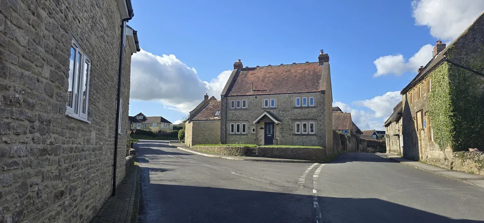 In 2026, the only obvious remnant of the first postcard is the corner of the old school with its angled drainpipe on the right. It has its own blue plaque to its founder, scientist Robert Boyle of Stalbridge, who founded a village school for poor boys here in 1711. Image: Courtenay Hitchcock